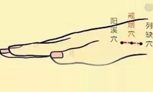 1、上午、中午、晚上各按摩戒煙穴一次(手指先按住陽溪穴,然后手指在皮膚上向手臂的方向滑動,約滑1~2厘米,指下就能感覺一個硬硬的骨性突起(橈骨莖突)這就是列缺穴了),每次10分鐘以上,至局部有酸、痛等輕微不適感為佳。在有吸煙欲望時,亦應加強按壓甜美穴處。