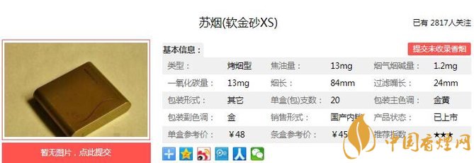 蘇煙軟金砂XS其實(shí)塑盒內(nèi)放置的煙支就是蘇煙軟金砂,只是換了個(gè)精致的包裝而已。目前已經(jīng)停產(chǎn),市面上比較少見,但卻時(shí)不時(shí)能遇到閑置的,其中以帝都居多,包裝十分有檔次。經(jīng)香煙網(wǎng)小編市場(chǎng)調(diào)查蘇煙軟金砂XS售價(jià)為48元/包。