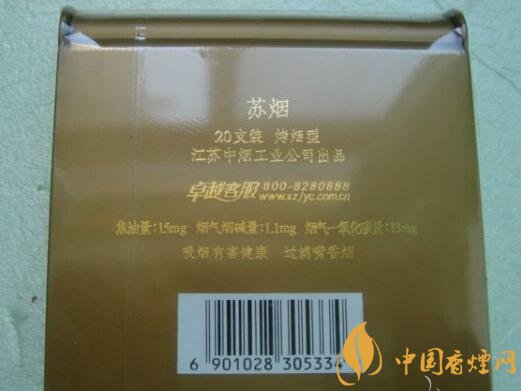 暗金色塑盒包裝,主體為方形,上下兩側(cè)作弧形處理,給人以輕巧圓潤(rùn)之感。正面左側(cè)一道極似女人身體曲線的“S”形劃過,旁邊有繁寫的“蘇煙”二字,右下方是“江蘇中煙工業(yè)公司出品”,設(shè)計(jì)簡(jiǎn)約,表意婉約。背面標(biāo)有商品的基本信息(包括三項(xiàng)理化指標(biāo)、條形碼等)和警示語。其余四面皆無文字或圖案。