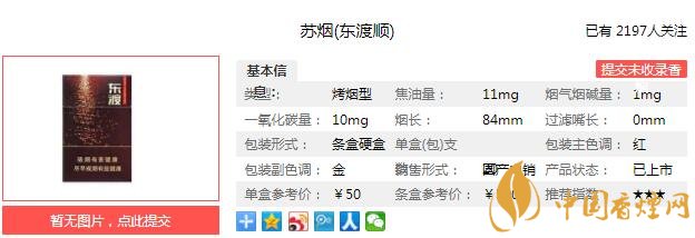 蘇煙東渡順煙支長(zhǎng)84mm,過(guò)濾嘴長(zhǎng)36mm,深棕的過(guò)濾嘴上有一條降焦線,字體較大的東渡字樣,以及與煙盒底部相同的印章順字印制于過(guò)濾嘴紙上的兩側(cè)。金色水松紙上印制的是一帆風(fēng)順字樣,完全呼應(yīng)了煙盒背面帆船的設(shè)計(jì)。下面我們一起來(lái)看蘇煙東渡順的參數(shù)信息:焦油量:11mg 煙堿量:1.0mg 一氧化碳量:10mg