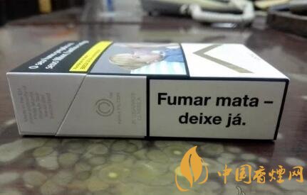 正面的包裝設(shè)計,也是目前歐盟版本的標(biāo)準(zhǔn)式樣。翻蓋上的文字為葡語,內(nèi)容自然是關(guān)于吸煙有害健康了。