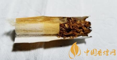煙絲以明黃為主,輔以少量的棕黃色煙絲,顯然是不同兩種不同品級的原片切絲混合而來,間雜有切得較細、揉捻的比較柔軟的煙梗。配方調(diào)和與現(xiàn)款零售版基本一致。