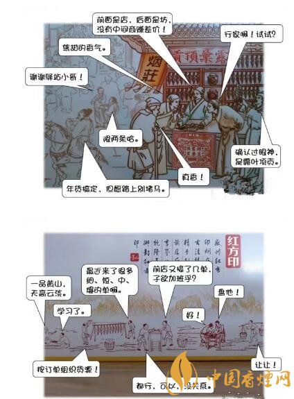 細看,正面的“前店”是一條古徽州商業(yè)街的圖樣,人頭攢動、熙熙攘攘,掛著“露葉頂貢”招牌的紅方印煙莊占據(jù)了C位,門口的“文幫”掌柜手持一片煙葉接受眾人圍觀;背面的“后坊”,則描繪了“武幫”的手工匠人們曬煙、制絲的勞作場景??上D案只能繪色、不能繪聲,假如身臨其境,會聽到什么樣的聲音呢?惡搞一下吧……