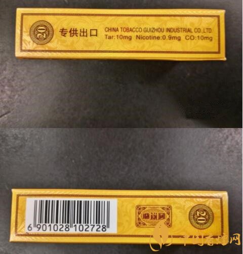 煙盒的兩側(cè)都有用到葉狀的底紋裝飾,左側(cè)用中文標(biāo)注了專供出口的身份,而貴煙公司名稱和理化指標(biāo)都用英文替代,焦油10mg/尼古丁0.9mg/一氧化碳10mg,數(shù)值不高不低。右側(cè)則印著中文的國酒香品名和商品條碼,掃碼并未顯示出口何地。