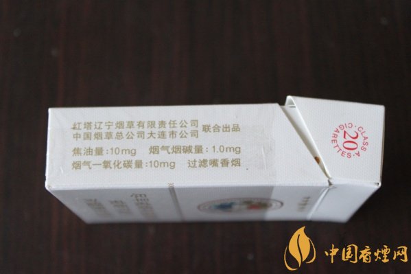 煙盒的右側(cè)注明了理化數(shù)值,標(biāo)注著由紅塔遼寧煙草和在連公司聯(lián)合出品,焦油量:10mg、煙氣煙堿量:10mg、煙氣一氧化碳量:10mg,三個(gè)10的理化數(shù)值,讓人感覺它的協(xié)調(diào)性很好。