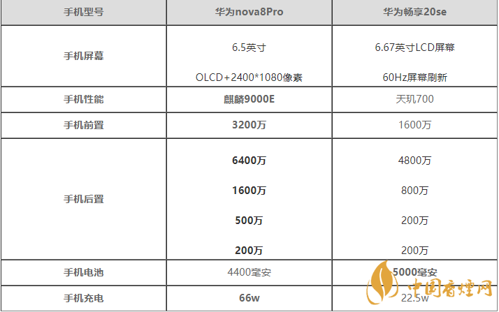 華為nova8Pro搭載4400毫安的電池,支持66w的充電速度。華為暢享20se支持5000毫安的超大電池,提供22.5w的充電速度