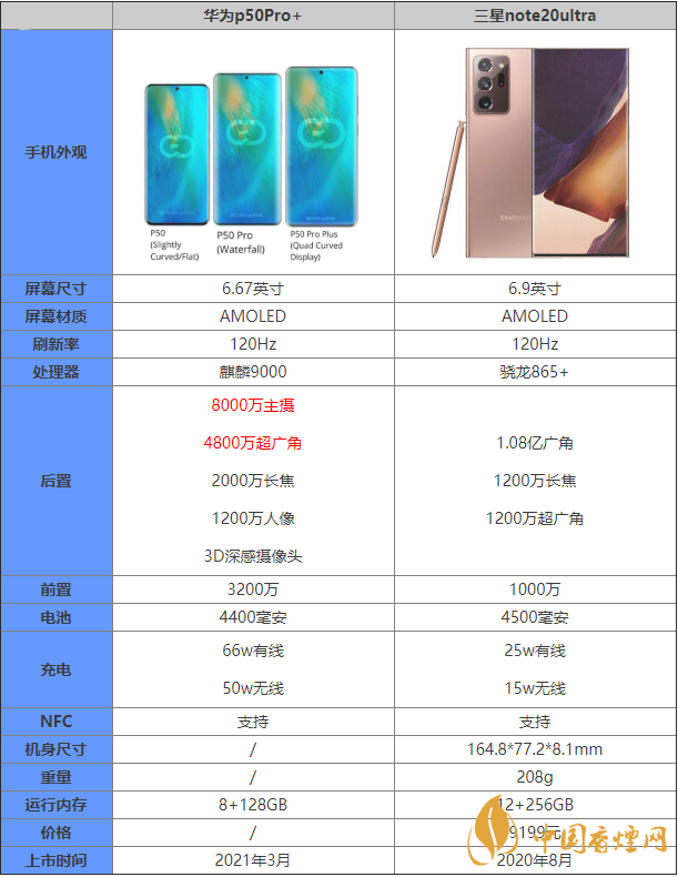 華為p50Pro+是華為即將發(fā)布的新款手機(jī),許多小伙伴對(duì)這款手機(jī)十分的關(guān)注,那么這款手機(jī)和三星note20ultra之間有什么特別之處?哪款手機(jī)更好?下面香煙網(wǎng)小編小編為大家?guī)碜钚碌氖謾C(jī)參數(shù)對(duì)比,感興趣的朋友快來看看吧。