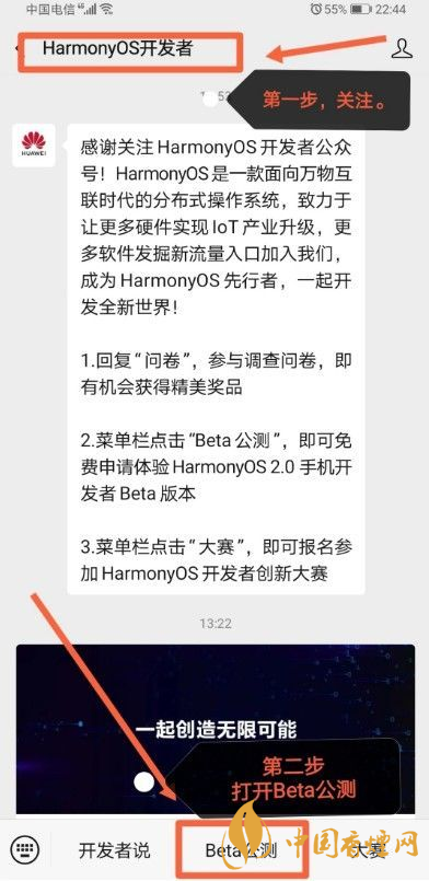 另外一種比較簡單的方法就是微信申請鴻蒙公測資格。關(guān)注HarmonyOS開發(fā)者公眾號!菜單欄點擊“Beta公測”,即可免費申請體驗HarmonyOS 2.0 手機開發(fā)者Beta版本,等待審核通過了即可。