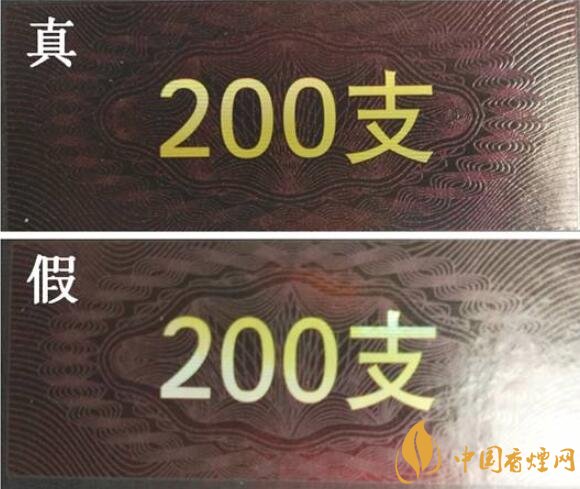 真煙“和天下”立體感強(qiáng),字體筆畫較粗用放大鏡看“HARMONIZATION”微縮字較清晰;假煙的全息防偽無立體感,用放大鏡看“HARMONIZATION”微縮字較模糊,且“和天下”字體筆畫較細(xì),與真品特征存在明顯差異。