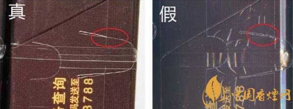 真煙條盒側(cè)面,小盒頂部均采用與人民幣相同效果的鈔線防偽技術(shù),由無數(shù)根交叉防偽細(xì)線編織在一起,油墨厚,交叉線條根根清晰完整無缺,線條錯(cuò)中有序,立體感強(qiáng)。假煙采用掃描復(fù)制技術(shù),其交叉線條清晰度差,無立體感,與真品防偽技術(shù)存在明顯差異。