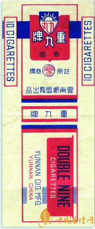 1945年,云南紙煙廠出品。創(chuàng)牌于1922年,為紀(jì)念護國名將蔡鍔等所領(lǐng)導(dǎo)的“重九起義”而創(chuàng)牌,重九牌歷史悠久,具有豐富的文化內(nèi)涵,是云南紙煙廠的榮譽產(chǎn)品。該牌號卷煙僅生產(chǎn)13.85箱,屬罕見珍貴煙標(biāo),具有歷史文物價值。1945年6月1日云南紙煙廠在昆明金碧日報刊登“重九”牌更換商標(biāo)紙盒啟示 , 以此啟示為證改寫了此枚珍貴歷史商標(biāo)的確切生產(chǎn)時間。