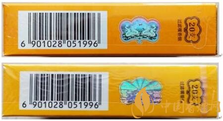 真品卷煙:花紋圖案燙金色彩明亮,線條凹陷鑲嵌在商標(biāo)紙上。