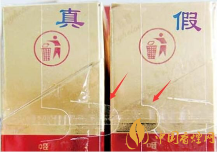 真煙的黃樓樓圖案,印刷精美、套色均勻,尤其是黃鶴樓圖案兩側(cè)的飛鶴翅膀邊緣棱角分明,線條較細(xì);而假煙的印刷工藝要粗糙的多,套色不均勻。相較于真煙,假煙黃鶴樓圖案沒有光澤,而且飛鶴的翅膀邊緣棱角不明顯。