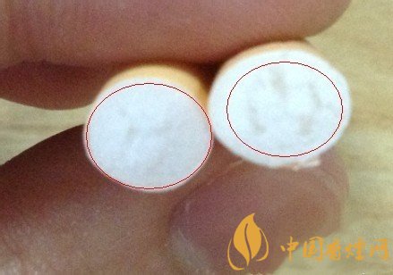 細(xì)看煙嘴角顏色,左邊黃色較右邊顯得較深,光憑這點(diǎn)可能會(huì)受光線的影響,用力揉搓煙嘴,就會(huì)發(fā)現(xiàn)右邊假煙部分濾嘴基本已經(jīng)散架,中間已經(jīng)變成了空心。而且黃色的紙也有所破損。而左邊的真煙嘴完好無(wú)損。只有些許揉捏痕跡。