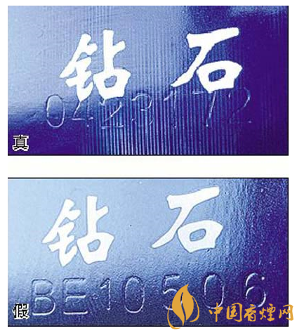 五看鉆石圖案:真煙鉆石圖案印刷清晰,色彩感強(qiáng),內(nèi)有微縮英文字母“DIAMOND”,圖案無凹凸感;假煙印刷不清晰,用手摸上去有凹凸感。