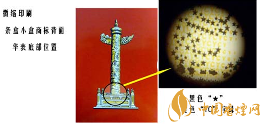 5.用放大鏡查看條盒小盒商標(biāo)背面華表底部位置,可以看到黑色“★”、黃色“YC”字母。