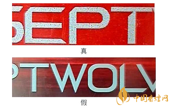 由于印刷方式的不同,真品“七匹狼”(豪情)條、盒上的中英文字體邊緣有鋸齒狀,假煙的字體邊緣光滑。